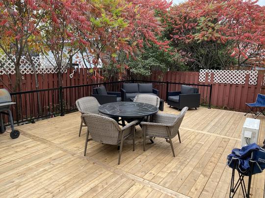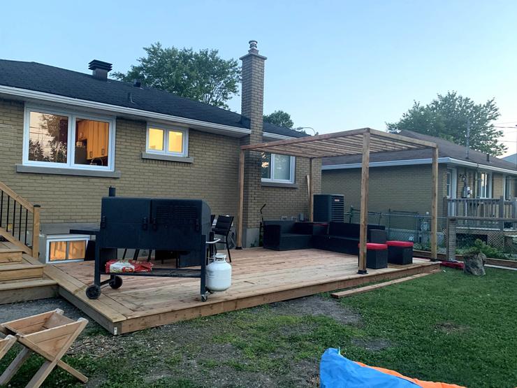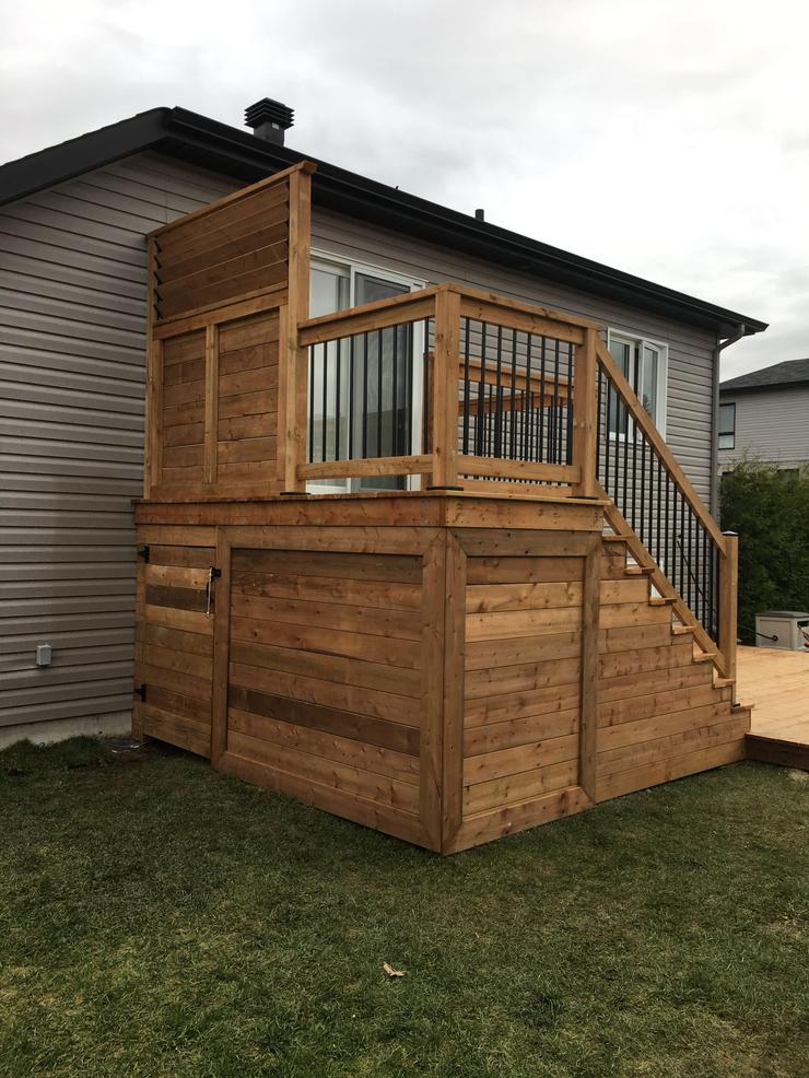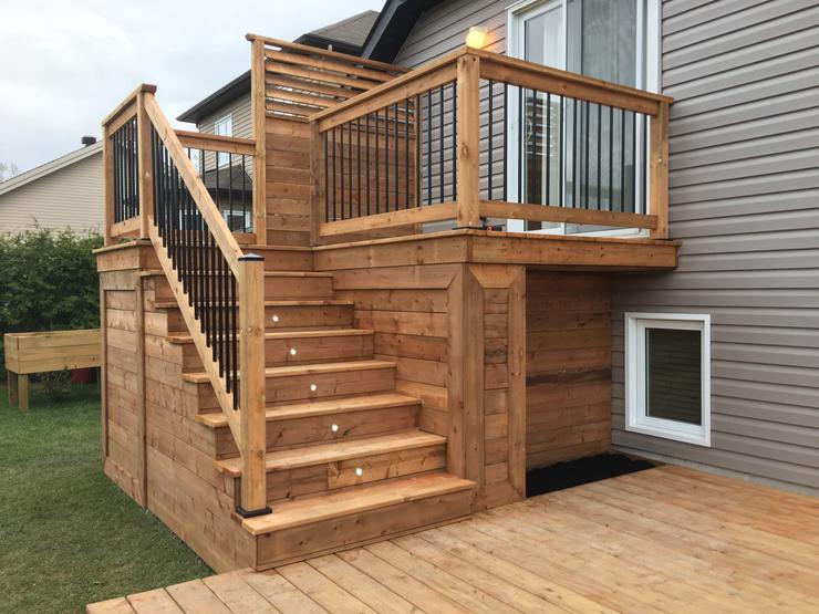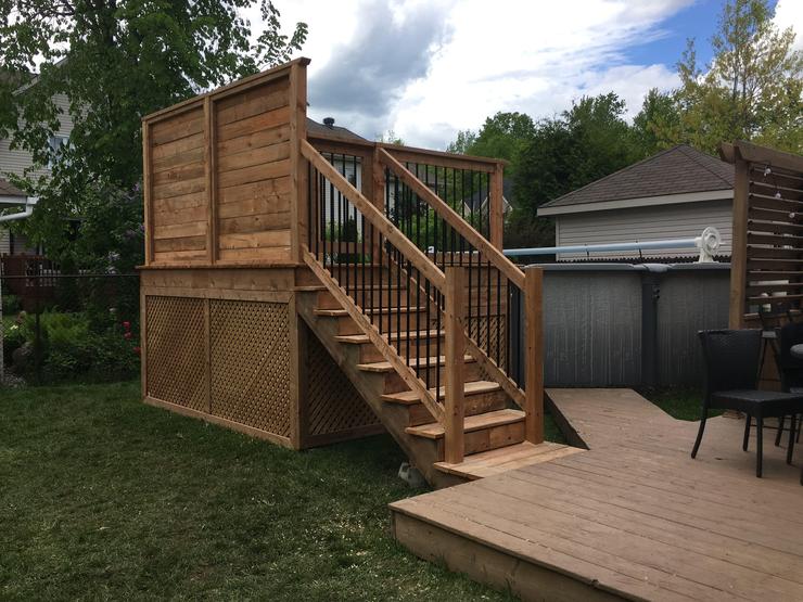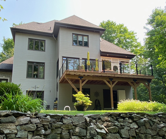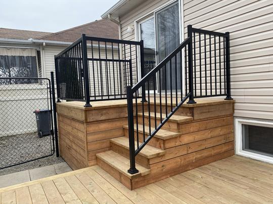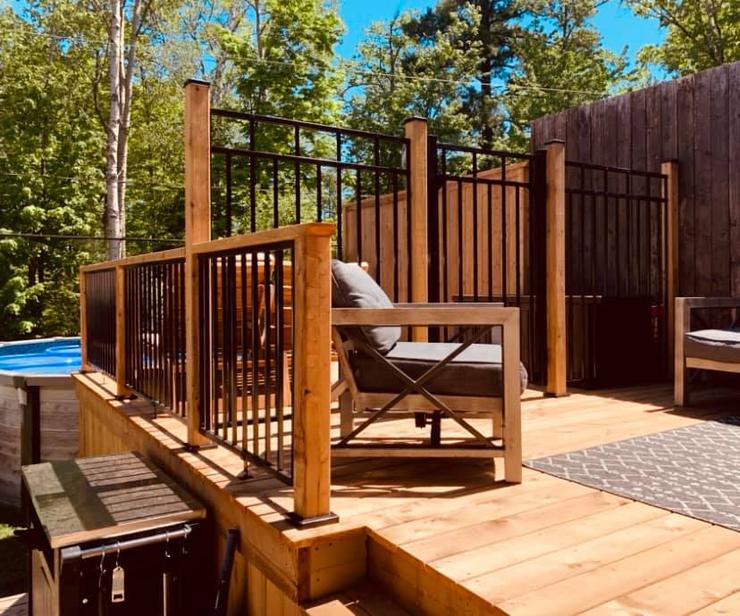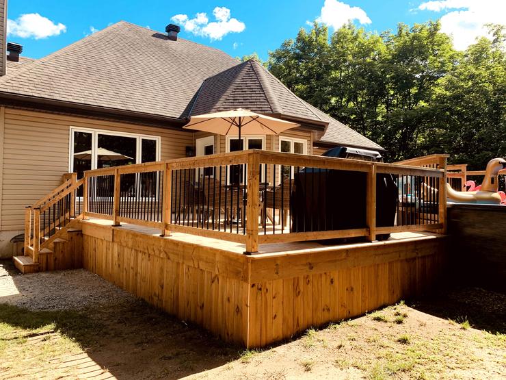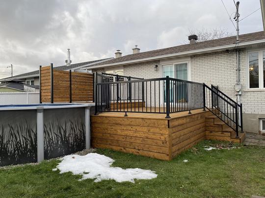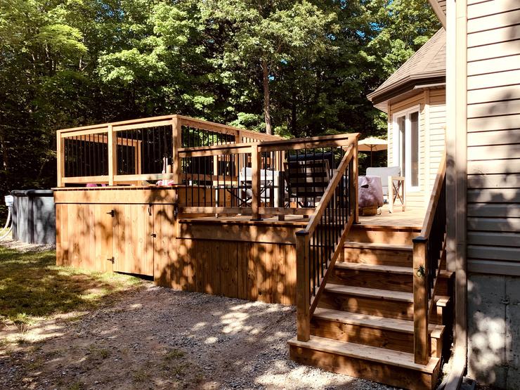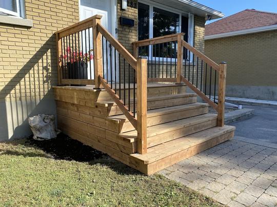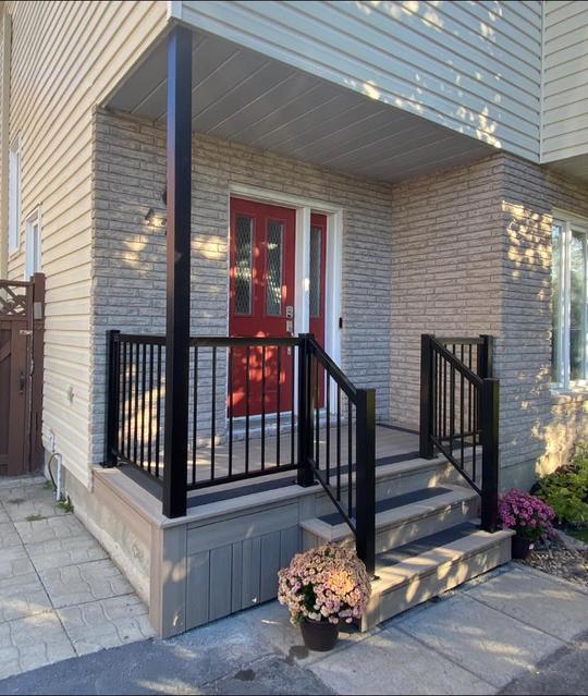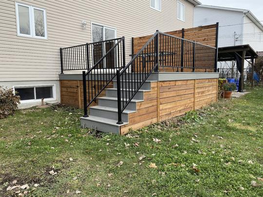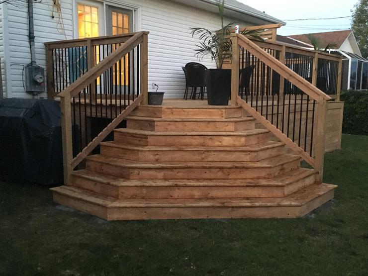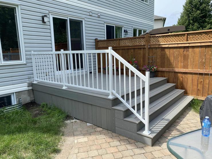 Veuillez également noter qu’en raison de la qualité moindre du bois traité disponible aujourd’hui, nous ne construisons plus de patios en bois traité, nous construisons exclusivement nos patios avec des matériaux à faible entretien uniquement avec les produits minérales de Deckorators ou produit en PVC TimberTech (Azek), accompagnés de rampes en aluminium.